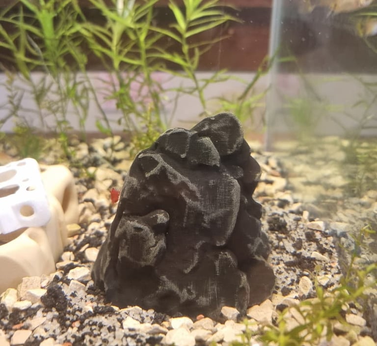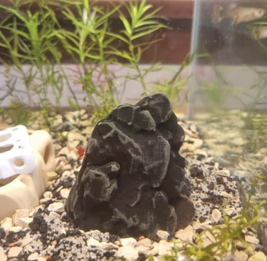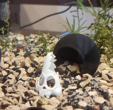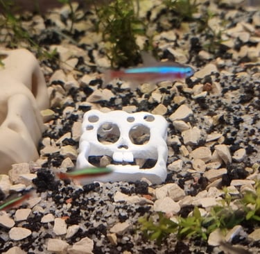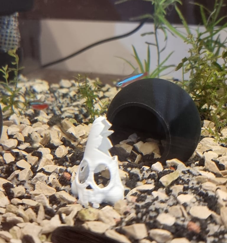 Figura de Patricio Estrella impresa en 3D con forma de calavera estilizada. Diseñada para decoración y refugio de peces.