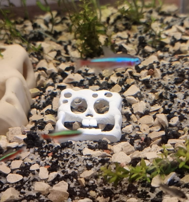 Figura de Bob Esponja impresa en 3D con forma de calavera estilizada. Diseñada para decoración y refugio de peces.